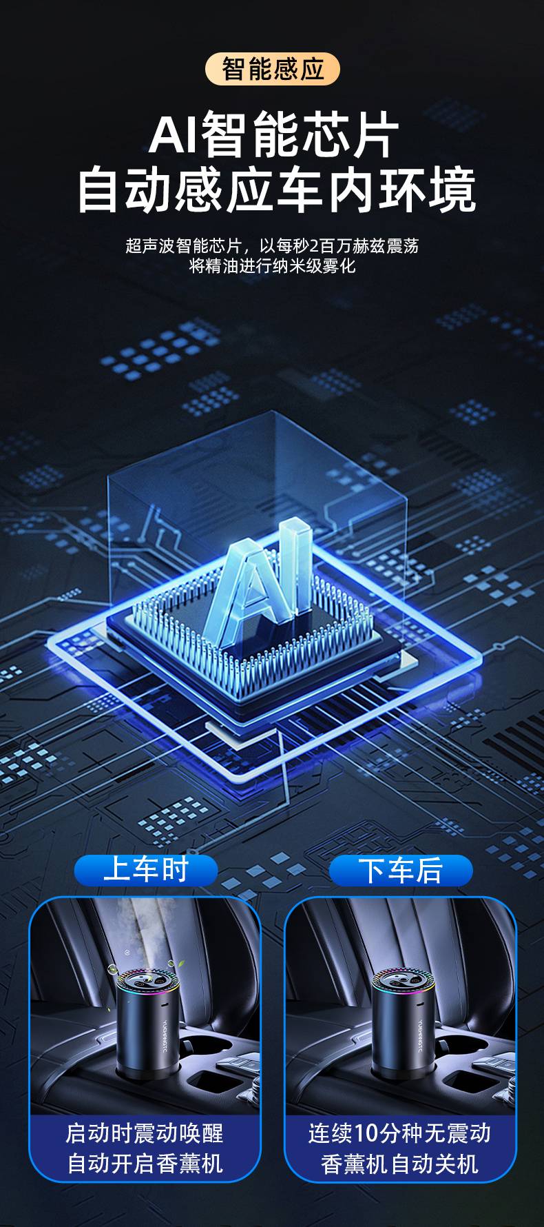 1. نینو لیول ایٹمائزڈ پولیمر خوشبو الٹراسونک ذہین چپ منتشر کرتی ہے ، جو الڈیہائڈس کو ہٹانے کے قابل ہے۔ نانو لیول کی ایٹمائزیشن کے لئے ضروری تیل کے ایٹمائزیشن کے لئے 2 لاکھ تعدد ماڈلن اوسیلیشن کے ساتھ فارمیڈہائڈ کو ہٹانے والی کار اروما تھراپی 2. گند کو گلنا ، پودوں سے خوشبودار اور خوشگوار نیا CI02 طہارت عنصر نکالیں ، اور ماخذ پر ضد کی بدبو کو گلنا 3. قدرتی نکالنے ، ماں اور بچے کے استعمال کے ل natural قدرتی فارمولا ، کوئی اضافی ، 0 الکحل ، ہلکی اور غیر پریشان کن خوشبو 4. اعلی اور کم درجہ حرارت کے خلاف مزاحم ہوا بازی کا مصر 5.360 ° تین جہتی خوشبو ، 360 ° مرئی خوشبو ، نازک ایٹمائزیشن ، ائر کنڈیشنگ کی ضرورت نہیں ، 360 ° آل راؤنڈ خوشبو 6. رومانٹک تارامی آسمان چمکتا ہوا تارکی اسکائی ایک خواب کی طرح کار میں نصب ہے ، ستاروں کی طرح ، کار میں رومانوی ماحول پیدا کرتا ہے 7. ذہین سینسنگ اے آئی ذہین چپ کار کے ماحول میں خود بخود الٹراسونک ذہین چپ کو محسوس کرتی ہے ، اور نانوسکل پر ضروری تیلوں کو 2 ملین ہرٹز فی سیکنڈ کی کمپن کے ساتھ ایٹمائز کرتی ہے۔ 8. خوشبو کی شدت کے ل your اپنے اور اپنے کنبے کی مختلف ترجیحات کو پورا کرنے کے لئے تین طریقوں اور رنگین محیط لائٹس کی ذہین ایڈجسٹمنٹ آن/آف بٹن کے ساتھ خوشبو کے چھڑکنے کی مدت کو تبدیل کریں 1. خوشبو: ہر تین منٹ میں ایک بار اسپرے کریں [ایک بار 1 سیکنڈ کے لئے] 2۔ مضبوط خوشبو: ہر منٹ میں ایک بار اسپرے کریں [ایک بار 2 سیکنڈ کے لئے] 3۔ مسلسل لگاتار اسپرے کے تین طریقے 10 منٹ کے اندر اندر کسی کمپن کا پتہ لگانے کے بعد خود بخود سو جائیں گے ، اور پھر جاگنے کے لئے دوبارہ کمپن کو محسوس کریں گے۔ 9.300mAh بڑی بیٹری جس میں بلٹ میں 300mAh بیٹری اور 500mAh پولیمر لتیم بیٹری دیرپا برداشت کے لئے ہے 10. تخصیص کی حمایت کریں